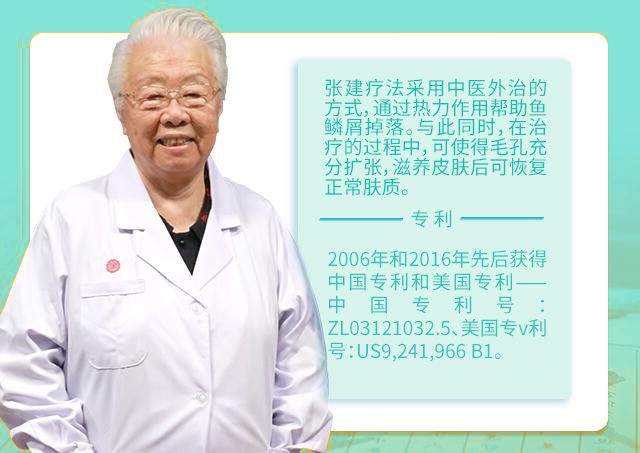 張建療法采用中醫(yī)外治的方式,通過熱力作用幫助魚鱗屑掉落。與此同時(shí),在治療的過程中,可使得毛孔充分?jǐn)U張,滋養(yǎng)皮膚后可恢復(fù)正常膚質(zhì) 在2006年和2016年先后獲得中國專利和美國專利 中國專利號:ZL03121032.5、美國專利號:US9,241,966 B1。